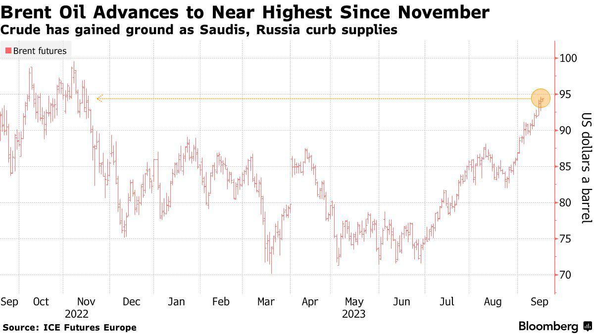 随着欧佩克+重要成员国沙特与俄罗斯继续额外削减原油供应量收紧市场,国际油价延续上涨势头。此外,沙特阿拉伯能源大臣阿卜杜勒-阿齐兹·本·萨勒曼即将在一次会议上就该国的原油政策和对净零政策的看法发表重要讲话。全球油价基准——布伦特原油(Brent)价格在连续三周上涨(涨幅共计11%)后上涨至每桶94美元上方,逼近95美元大关,接近10个月以来的最高点。