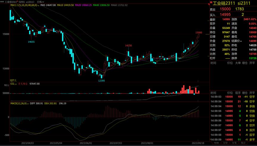 进入9月以来,工业硅摆脱了近三个月的振荡状态,走出一轮较为流畅的突破上涨行情。昨日,工业硅期货主力SI2311合约盘中触及5月10日以来高位15000元/吨,报收14995元/吨,上涨1.63%。现货方面,工业硅现货报价继续上涨。据SMM数据,9月18日,工业硅533#报价15000元/吨,自9月以来已累计上涨1050元/吨。业内人士分析指出,当前工业硅库存依然偏高,终端需求仍处低迷态势,使得市场显现出一定矛盾特征,加之西南丰水期已过,成本的抬升渐行渐近,工业硅期货整体上涨空间或相对有限。