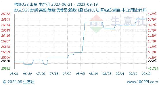 9月19日,生意社棉纱32S基准价为26825.00元/吨,与本月初(26675.00元/吨)相比,上涨了0.56%。
