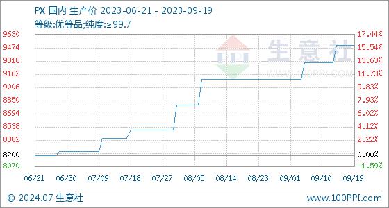 9月19日,生意社PX基准价为9500.00元/吨,与本月初(9100.00元/吨)相比,上涨了4.40%。