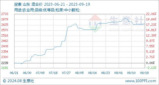 9月19日,生意社尿素基准价为2635.00元/吨,与本月初(2646.67元/吨)相比,下降了-0.44%。