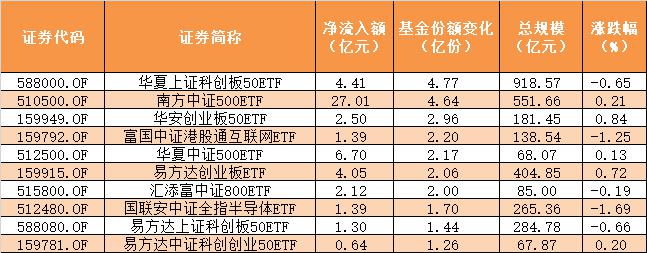 其次是南方中证500ETF,微涨0.21%,但基金份额增加了4.64亿份,净流入额高达27.01亿元。