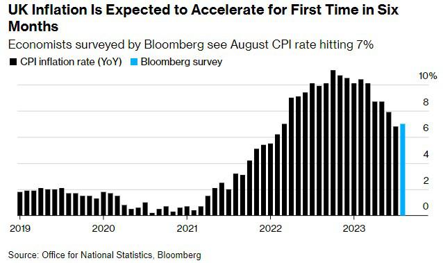 根据对30多个经济学家调查的预测中值,定于周三公布的英国通胀数据可能会显示,8月通胀涨幅从7月份的6.8%升至7%。这将标志着自今年2月以来经济首次加速增长,经济学家将其归因于燃油价格波动。
