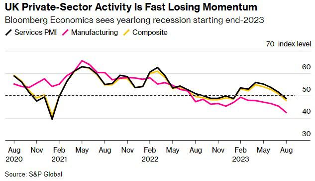 自6月以来,英国经济前景变得黯淡,这支持了连续14次加息开始对产出产生影响的观点。在整体经济停滞的同时,物价继续上涨的风险引发了人们的担忧,即英国和欧洲正在走向“滞胀”时期。
