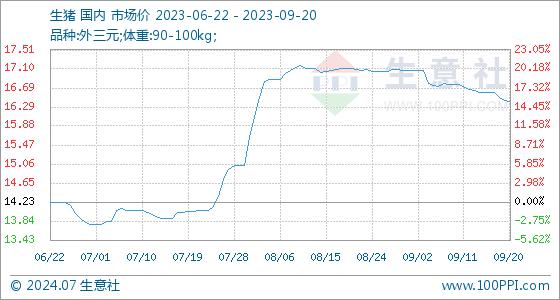 9月20日,生意社生猪基准价为16.43元/公斤,与本月初(17.08元/公斤)相比,下降了-3.81%。