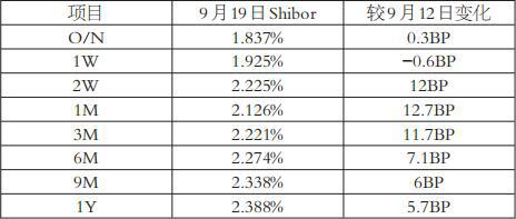 本周,市场利率整体呈现上行态势。一方面,中秋节、国庆节临近,民间资金需求转旺,短端利率上升;另一方面,稳增长政策逐步显效,市场资金需求明显好转,中长端利率随之上升。截至9月19日,上海银行间同业拆放利率(Shibor)隔夜、2周期、1月期、3月期、6月期、9月期、1年期利率分别报收于1.837%、2.225%、2.126%、2.221%、2.274%、2.338%、2.388%,较9月12日分别上升0.3、12、12.7、11.7、7.1、6、5.7BP;1周期利率报收于1.925%,较9月12日下降0.6BP。