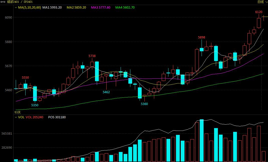 9月20日,国内纸浆期货继续上行,主力合约2401盘中一度突破6100元/吨水平,刷新近六个月新高,最后收于6084元/吨,连续第五日收涨。期货日报记者采访了业内分析师,就近期纸浆价格强势上行原因、现货市场实际供需表现、“金九银十”旺季预期落地情况进行交流,同时了解他们对后市浆价表现的看法。