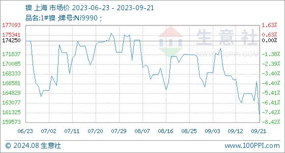 9月21日,生意社镍基准价为166983.33元/吨,与本月初(166000.00元/吨)相比,上涨了0.59%。