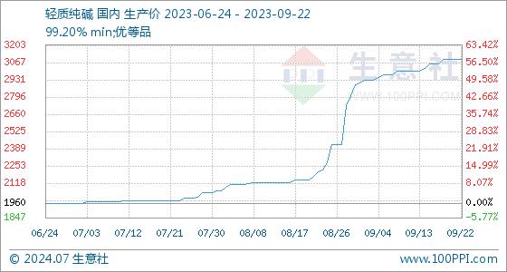 9月22日,生意社轻质纯碱基准价为3090.00元/吨,与本月初(2910.00元/吨)相比,上涨了6.19%。