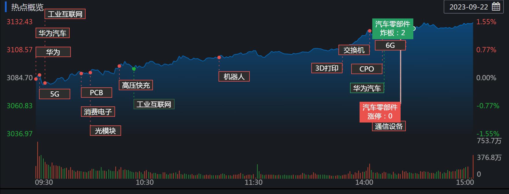 周五(9月22日),A股三大股指震荡上行,全线飘红,涨幅均超1%。截至收盘,上证指数涨1.55%报3132.43点,深证成指涨1.97%报10178.74点,创业板指涨2.32%报2013.34点,两市合计成交金额达7654.59亿元,较前一交易日有所放大,北向资金净买入额74.93亿元。总体上看,两市个股涨多跌少,超4400只个股实现上涨,形成普涨格局。其中,涨停个股达35只,跌停个股达13只。