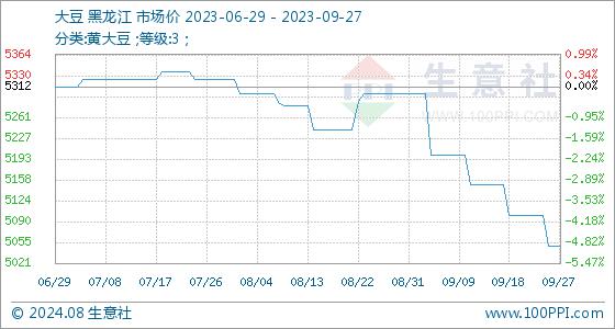 9月27日,生意社大豆基准价为5050.00元/吨,与本月初(5300.00元/吨)相比,下降了-4.72%。