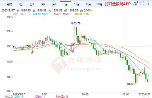 周三(9月27日)本交易日现货黄金日内维持震荡走势,今日开盘报1900.19美元/盎司,最高触及1903.79美元/盎司,最低触及1896.31美元/盎司,截止发稿金价报1896.64美元/盎司,跌幅0.19%。