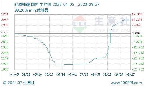 据生意社监测数据显示,9月份纯碱价格整体向上运行。轻质纯碱月初市场均价为2930元/吨,月末市场均价3090元/吨左右,价格上涨5.46%,较去年同期上涨15.73%。9月26日轻质纯碱商品指数为158.46,与昨日持平,较周期内最高点189.10点(2021-11-07)下降了16.20%,较2015年11月18日最低点63.15点上涨了150.93%。(注:周期指2011-09-01至今)