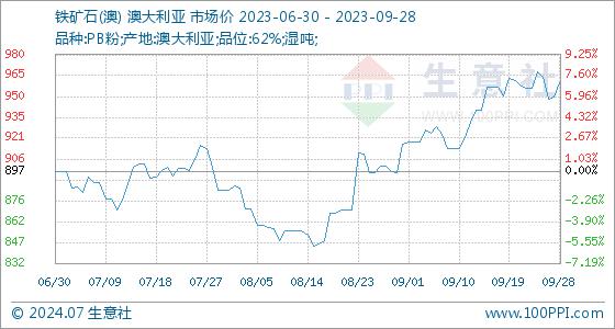 9月28日,生意社铁矿石(澳)基准价为950.67元/吨,与本月初(916.89元/吨)相比,上涨了3.68%。