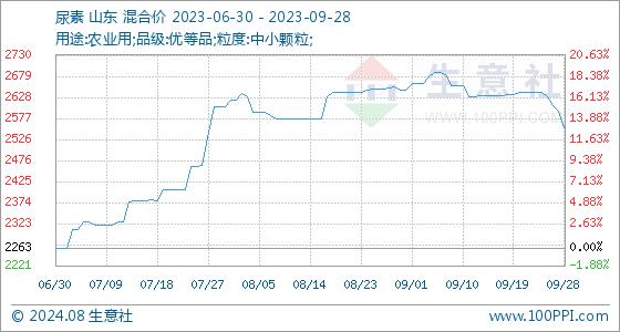 9月28日,生意社尿素基准价为2595.00元/吨,与本月初(2646.67元/吨)相比,下降了-1.95%。