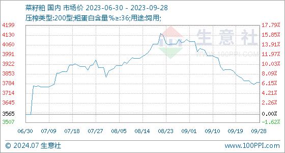 9月28日,生意社菜籽粕基准价为3791.67元/吨,与本月初(4100.00元/吨)相比,下降了-7.52%。