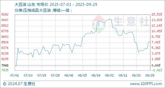 9月29日,生意社大豆油基准价为8526.00元/吨,与本月初(9036.00元/吨)相比,下降了-5.64%。