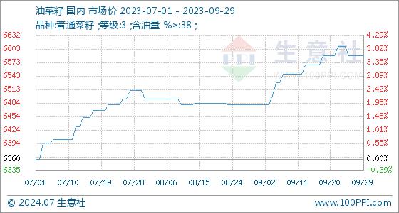 9月29日,生意社油菜籽基准价为6588.00元/吨,与本月初(6480.00元/吨)相比,上涨了1.67%。