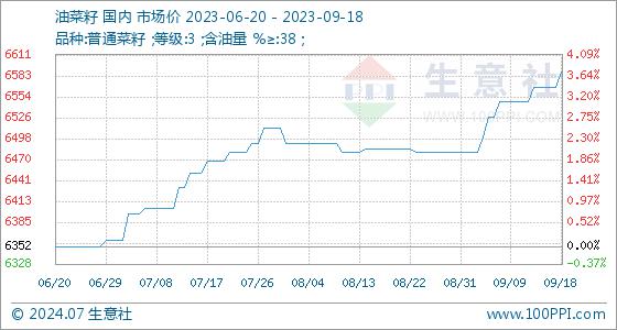 9月18日,生意社油菜籽基准价为6568.00元/吨,与本月初(6480.00元/吨)相比,上涨了1.36%。