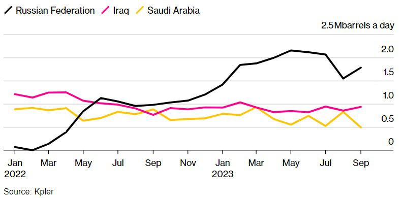 行业分析公司Kpler SAS的数据显示,受供应充足和价格折扣的推动,9月份俄罗斯对印度的石油出口量从8月份的七个月低点跃升了15%,达到178万桶/日。该公司首席原油分析师维克托卡托纳(Viktor Katona)表示,由于俄罗斯禁止柴油出口,意味着国内炼油商将降低产能,更多原油将供应给海外,因此印度从俄罗斯进口的“空间很大”。
