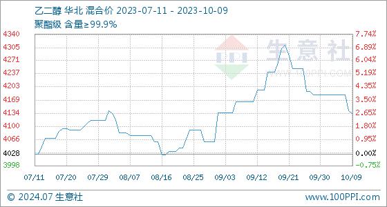 10月9日,生意社乙二醇基准价为4141.67元/吨,与本月初(4183.33元/吨)相比,下降了-1.00%。