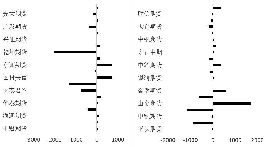 空头方面,有9家席位持续增仓,11家减仓空头头寸,其中增仓超过1000手的席位是山金期货(1713手)。减仓超过800手的席位分别是中信期货(882手)、齐盛期货(1161手)。
