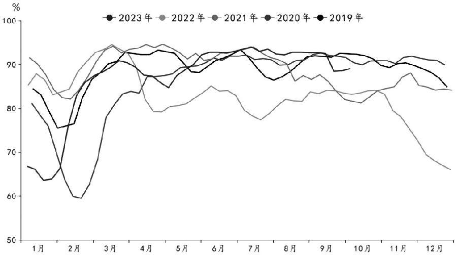 9月下旬,聚酯行业开工从93%附近回落至89%附近,但是考虑到行业处于消费旺季,10月聚酯开工负荷依旧存在回升预期。目前来看,终端织造开工已经从长假期间的低位回到假期之前的水平,刚需依旧存在,10月还有备货预期,需求韧性犹在。不过,产业链不乏利空担忧,一方面是长假期间国内涤丝产销清淡,据CCF评估,涤丝累库可能在6—7天。另一方面是原油价格下跌会打压下游市场补库的积极性,产业链可能存在阶段性负反馈的压力。7月下游开始备战旺季,各环节的需求有所提前,10月的旺季需求存在不确定性。