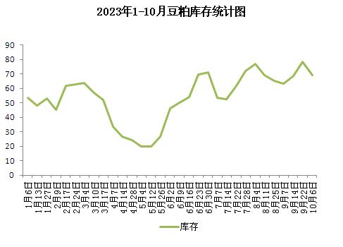 供应面:2023年原料进口大豆数量不断增加,远超同期,其中,8月大豆进口936.2万吨,1-8月累计大豆进口7165.4万吨,同比增17.9%。9月以后,港口大豆库存依旧处于较高水平。截止10月10日当周,港口大豆库存高达680万吨一线,周环比增加0.79%。原料供应压力仍在,豆粕行情上涨承压。
