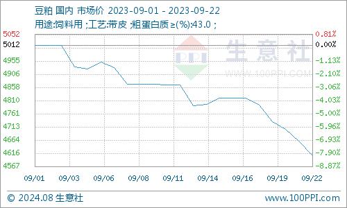 据生意社商品行情分析系统显示:本周豆粕行情大幅下跌,价格下跌。9月18日,豆粕市场均价4794元/吨,9月22日,豆粕市场均价4608元/吨,价格下跌3.88%。
