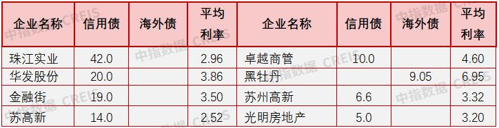 从典型房企债券发行来看,本月珠江实业融资额度最高,合计42亿元,苏高新平均融资利率2.52%,融资成本最低。