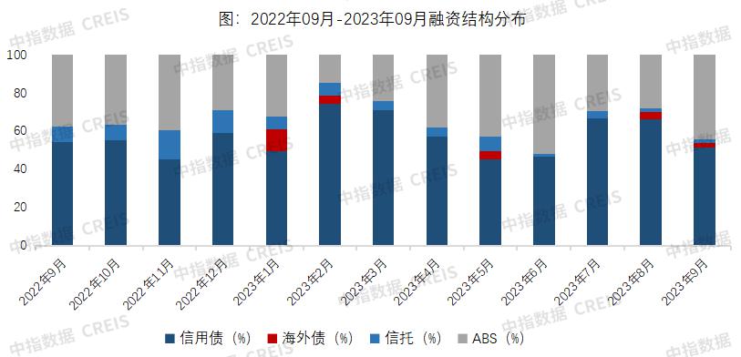从融资结构来看,9月信用债规模占比51.2%,海外债占比2.6%,信托占比1.8%,ABS融资占比44.4%。具体来看,9月,房地产行业信用债融资179.0亿元,同比大幅下降53.8%,环比下降61.4%;海外债发行金额9.0亿元,环比下降63.5%;信托融资6.2亿元,同比下降89.1%,环比下降53.2%;ABS融资155.1亿元,同比下降42.6%,环比下降20.8%。