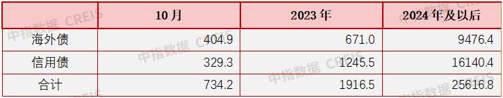 2023年10月到期债券余额为734.2亿元,其中,海外债占比为55.1%,信用债占比为44.9%。2023年内到期债券余额为1916.5亿元,其中,海外债占比为35.0%,信用债为65.0%。