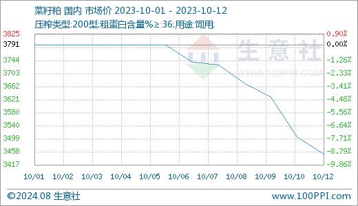据生意社商品行情分析系统监测,10月1日菜粕市场均价为3791元/吨,10月12日菜粕市场均价为3451元/吨,期间下跌幅度在8.97%。