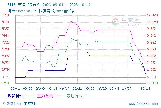 节后期货持续下跌,现货市场因此受“买涨不买跌”情绪主导,节后钢厂招标出价较节前重心下移,而虽成本面还存在一定支撑(节后兰炭价格有所上调;部分地区电价稍涨),但下游钢厂减停产集中的消息与之博弈,硅铁在自身供应水平偏高的情况下,工厂高位报盘较难落实,市场信心逐渐松动。据生意社商品行情分析系统,10月13日硅铁(牌号:FeSi75~B;粒度等级/mm:自然块)宁夏地区市场报价在6800-7000元/吨附近,市场均价6914元/吨,跌3.59%。