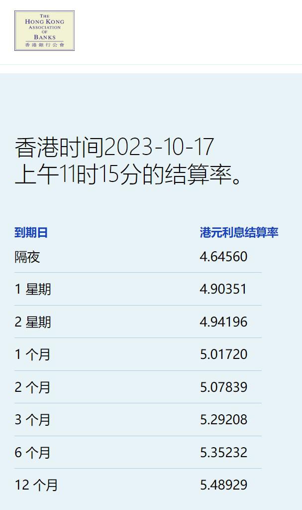 10月17日,港元拆息全线上扬,其中,与楼按相关的一个月拆息两连升,重上5%水平,报5.01720%,反映银行资金成本的三个月拆息连升三天,报5.29208%,创三周新高,与同期美元LIBOR息差收窄37基点。隔夜息回升至4.64560%,一周钱报4.90351%。长息方面,六个期及一年期分别反弹至5.35232%及5.48929%。