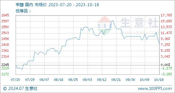 10月18日,生意社甲醇基准价为2460.00元/吨,与本月初(2478.33元/吨)相比,下降了-0.74%。