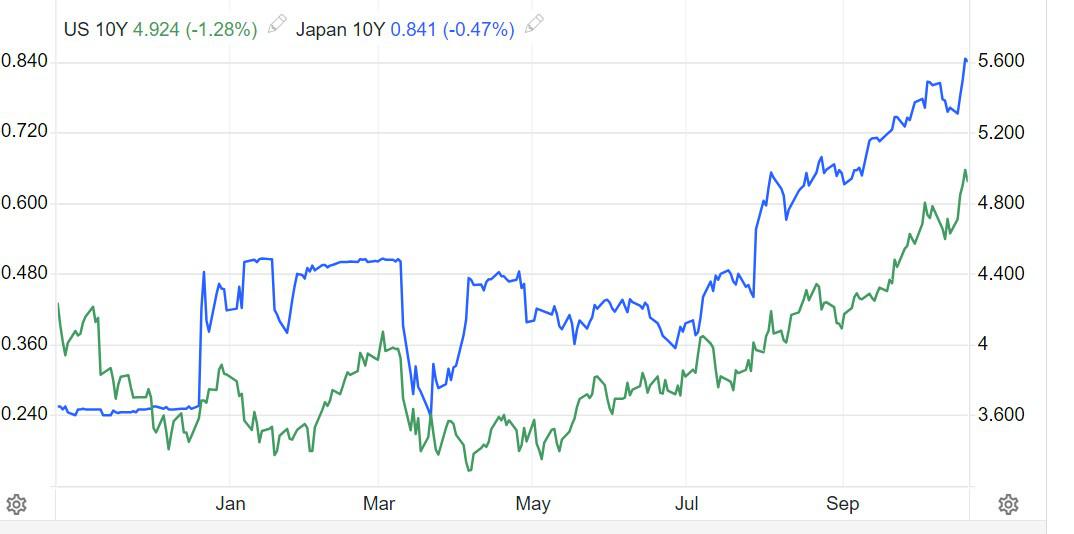 美国10年期国债收益率目前在4.93%附近,几乎是日本10年期国债收益率(0.84%左右)的接近6倍。日本央行行长植田和男周五表示,日本央行将继续耐心地保持宽松的货币政策,以实现稳定、可持续的2%通胀目标。
