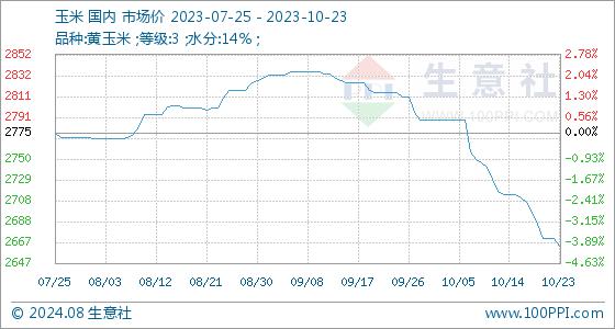 10月23日,生意社玉米基准价为2671.43元/吨,与本月初(2788.57元/吨)相比,下降了-4.20%。