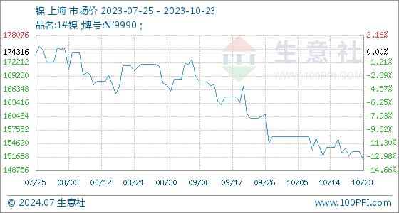 10月23日,生意社镍基准价为152850.00元/吨,与本月初(156116.67元/吨)相比,下降了-2.09%。