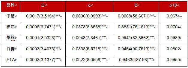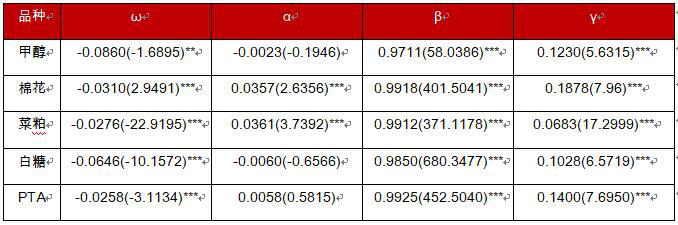 结论2:棉花和菜粕都存在显著的非对称性,这表明上涨行情波动率更容易出现大幅上涨。甲醇、白糖和PTA的波动率非对称性不显著,这表明上涨和下跌都会引起波动率上涨。