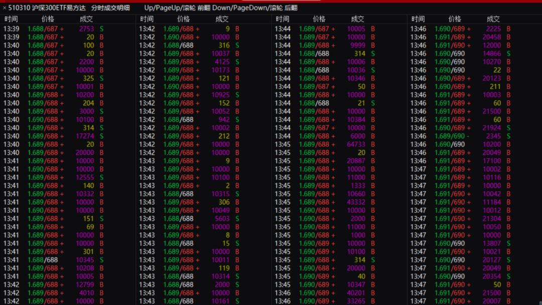 在昨天中央汇金出手之后,今天市场一度又被外资带偏。然而,今天下午再现惊人一幕。沪深300ETF易方达在下午一点四十五分左右,突然出现非常多的整数买单,并在随后的15分钟之内成交放大至将近4亿元水平。