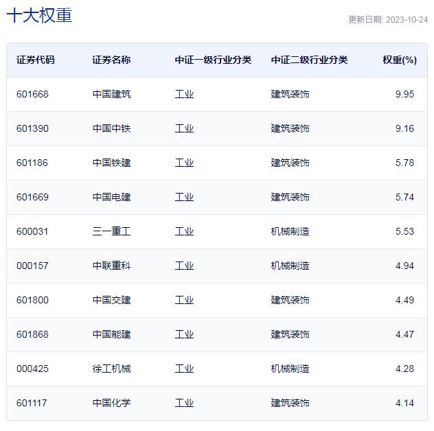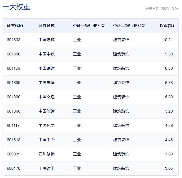 中证基建工程指数从沪深市场中选取建筑与工程、建筑装修行业的上市公司证券作为指数样本,以反映基建工程领域相关上市公司证券的整体表现。其成分股行业属性鲜明,聚焦基础建设、专业工程、房屋建设相关行业,共有50只成分股。