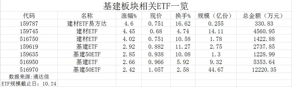 点评:相比建材类ETF暴涨,基建类ETF同样反弹强势,多只基建ETF涨幅在2.5%左右,其中,基建ETF(159619)涨幅最大,达到2.9%,该ETF追踪是中证基建指数。
