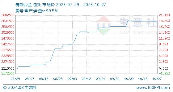 10月27日,生意社镝铁合金基准价为2630000.00元/吨,与本月初(2585000.00元/吨)相比,上涨了1.74%。