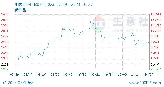 10月27日,生意社甲醇基准价为2430.00元/吨,与本月初(2478.33元/吨)相比,下降了-1.95%。