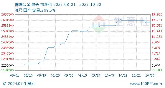 10月30日,生意社镝铁合金基准价为2610000.00元/吨,与本月初(2585000.00元/吨)相比,上涨了0.97%。