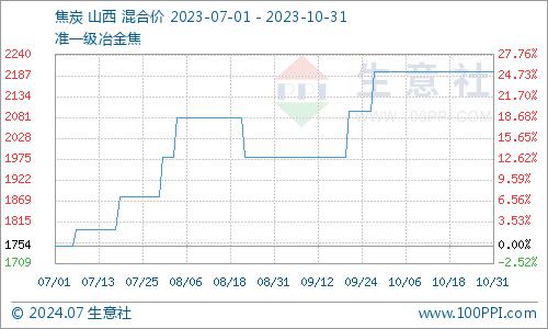 据生意社商品行情分析系统显示,国庆假期期间,受环保检查影响,产地供应缩紧,炼焦煤价格坚挺。假期过后,市场情绪降温,线上竞拍涨跌互现,下游对高价煤炭接受程度较低,炼焦煤价格盘整运行为主。下游焦炭方面:据生意社商品行情分析系统:2023年10月焦炭市场暂稳运行,截止发稿山西地区准一级冶金焦价格在2196.67元/吨,持平。目前焦炭市场整体偏弱运行,供应方面焦企近期开工整体偏稳,开工率较月初略有下滑,焦炭供应较稳定。需求方面多按需采购。总的来说目前焦炭市场整体偏弱运行,焦企心态偏淡,市场后市预期普遍偏弱,预计短期内保持偏弱运行为主,