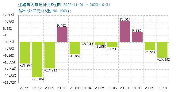 据生意社商品行情分析系统,10月份国内外三元生猪价格持续低位震荡下行,10月1日均价16.13元/公斤,10月31日均价14.47/公斤,月内下跌10.29%。