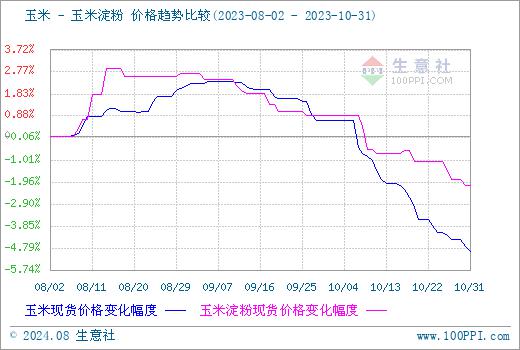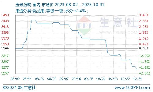 据生意社商品行情分析系统,10月国内玉米淀粉价格整体震荡下行,10月1日食用一级玉米淀粉均价为3374.00元/吨,10月31日均价为3274.00元/吨,月内下跌2.96%。
