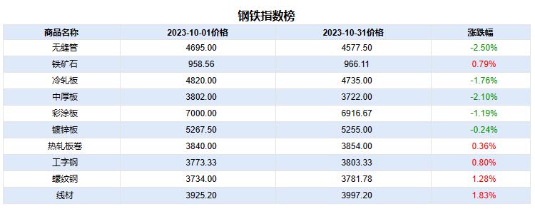 分品种看,9月钢铁品种出现涨跌互现的分化,其中,热轧板卷、螺纹钢、线材、工字钢较上月末有所上涨,主要受月末政策提振预期,乐观情绪支持,而月度下跌的品种为冷轧、镀锌板、彩涂板、中厚板,主要是政策刺激下需求释放节奏未有太明显好转,整体波动空间有限。